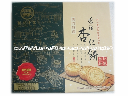 咀香園餅家及鉅記餅家這兩家的杏仁餅聽說在澳門很有名,惠玲幫我買的就是鉅記餅家的杏仁餅,這一年來越來越喜歡吃杏仁製品,maybe是Ken的口水吃太多被影響了,我很愛吃鉅記的杏仁餅,但是怕惠玲帶的太辛苦,所以我都只請她幫我帶一盒,一盒12個,我自己都捨不得吃,幾乎整盒都拿來孝敬家人。